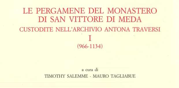 TIMOTHY SALEMME E MAURO TAGLIABUE, Le pergamene del monastero di San Vittore di Meda custodite nell’archivio Antona Traversi, volume I (966 – 1134), Cesena – Badia di Santa Maria del Monte 2024, in Italia Benedettina – Studi e documenti di storia monastica. Pagg. 363. ISBN 978-88-98104-22-2.